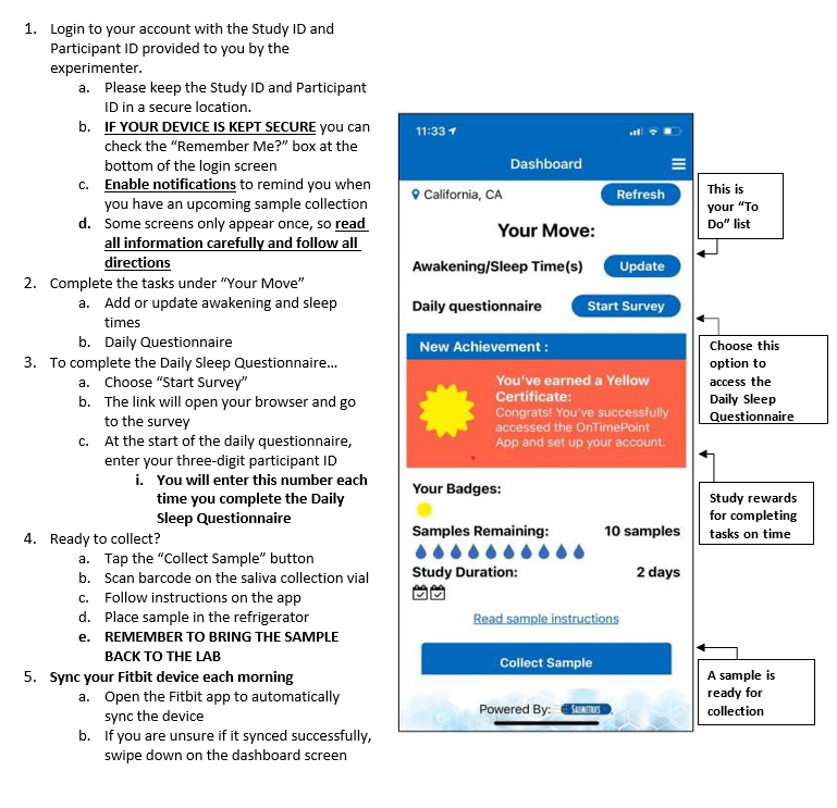 The OnTimePoint app will be used for every saliva sample you collect during the study. Additionally, if you are participating in the sleep substudy you will use the OnTimePoint app to complete the daily sleep surveys.